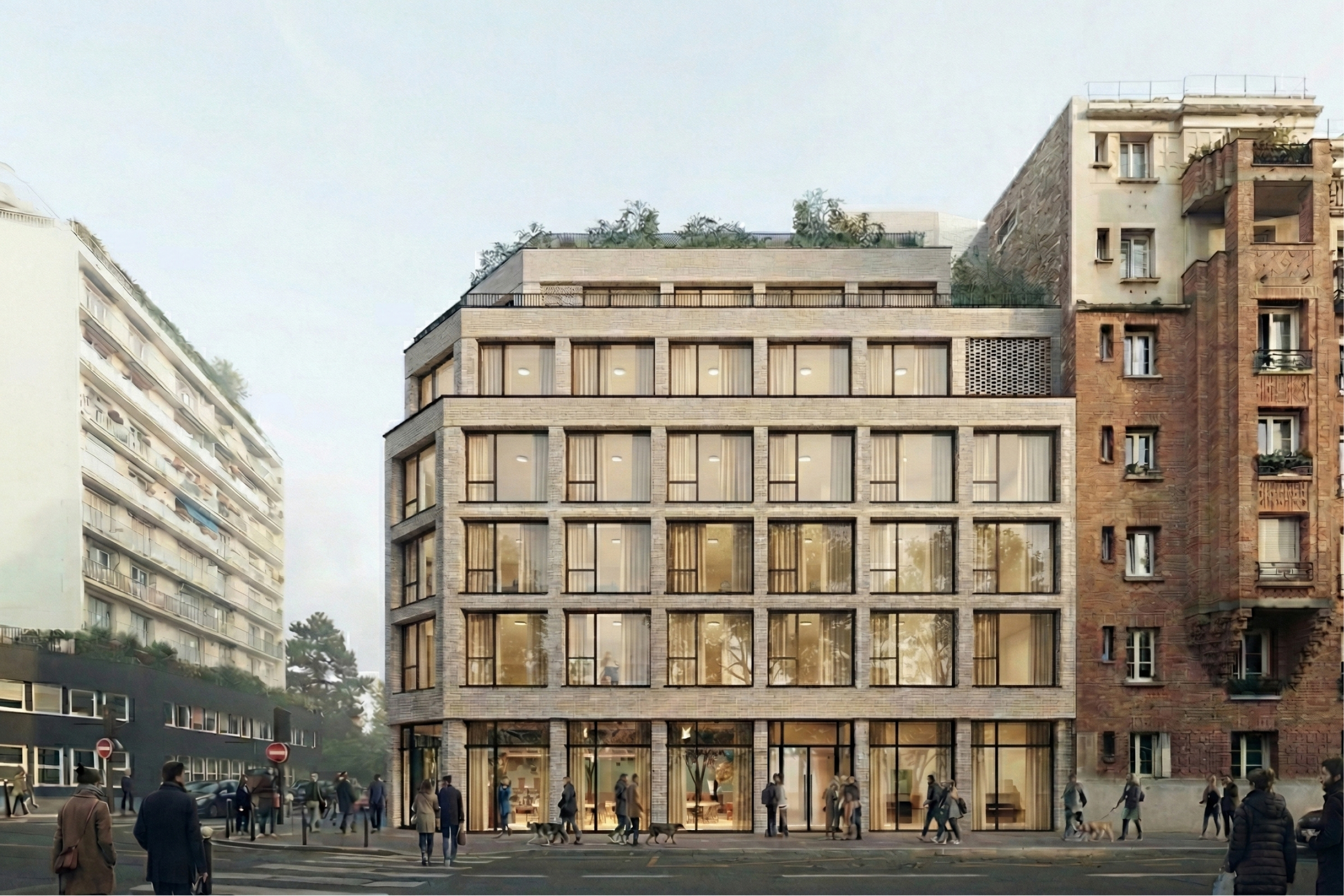 Le projet intègre des retraits pour préserver les vues existantes des immeubles voisins au 47 rue des Plantes. Chaque étage de bureaux a été conçu pour maximiser l’apport de lumière naturelle et offrir un accès direct à des terrasses extérieures. Le bâtiment présente une façade en briques pleines, dont le dessin et la rythmique réinterprètent les façades voisines, tout en conservant un dialogue harmonieux avec les alentours. Les attiques en retrait sur rue créent de grandes terrasses végétalisées.