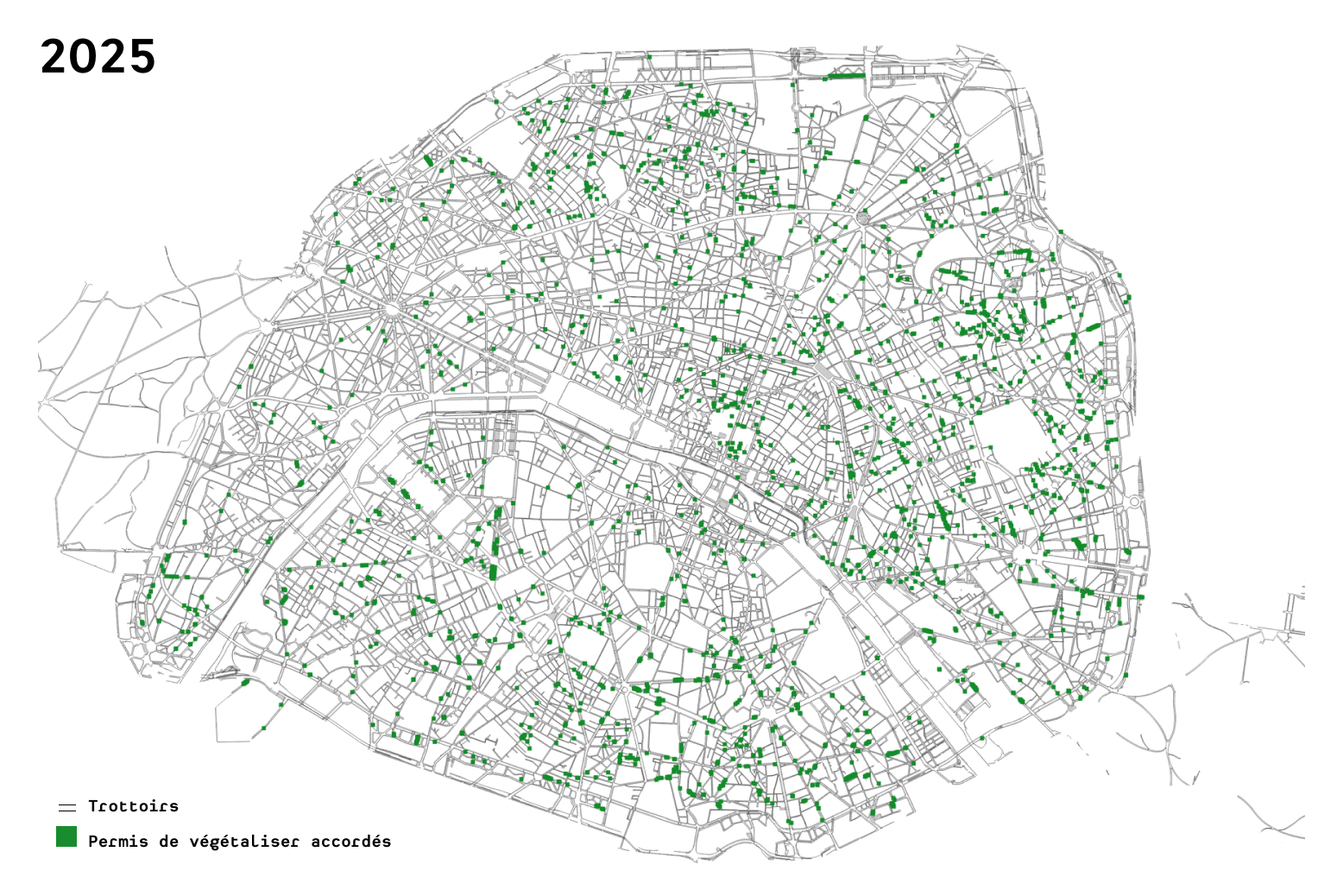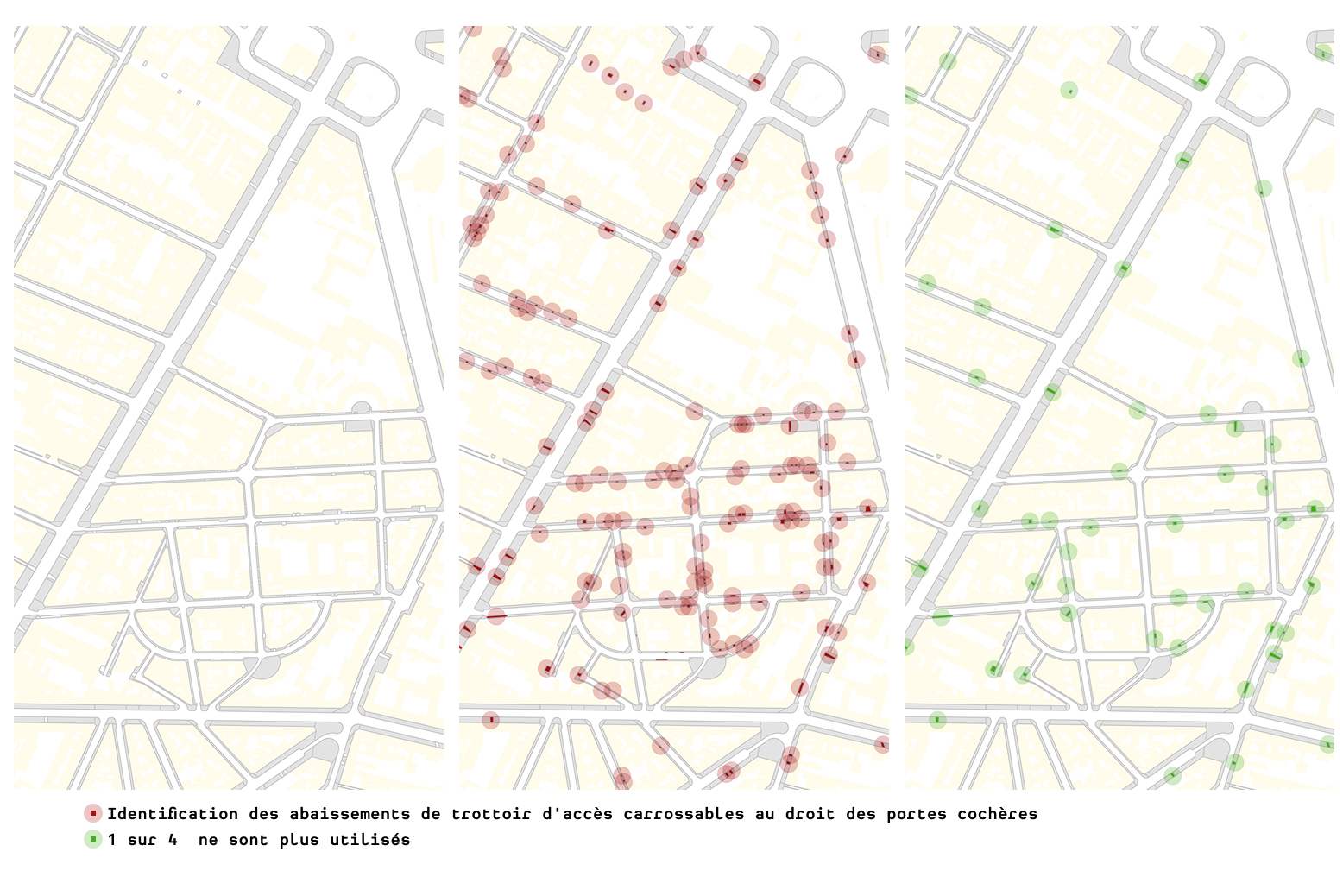 Notre étude s'appuie sur un repérage exhaustif de l'ensemble des anciens abaissements de trottoir donnant sur des portes cochères. Cette cartographie fine permet d'identifier les sites potentiels et de croiser ces données avec les permis de végétaliser déjà accordés par la Ville de Paris.