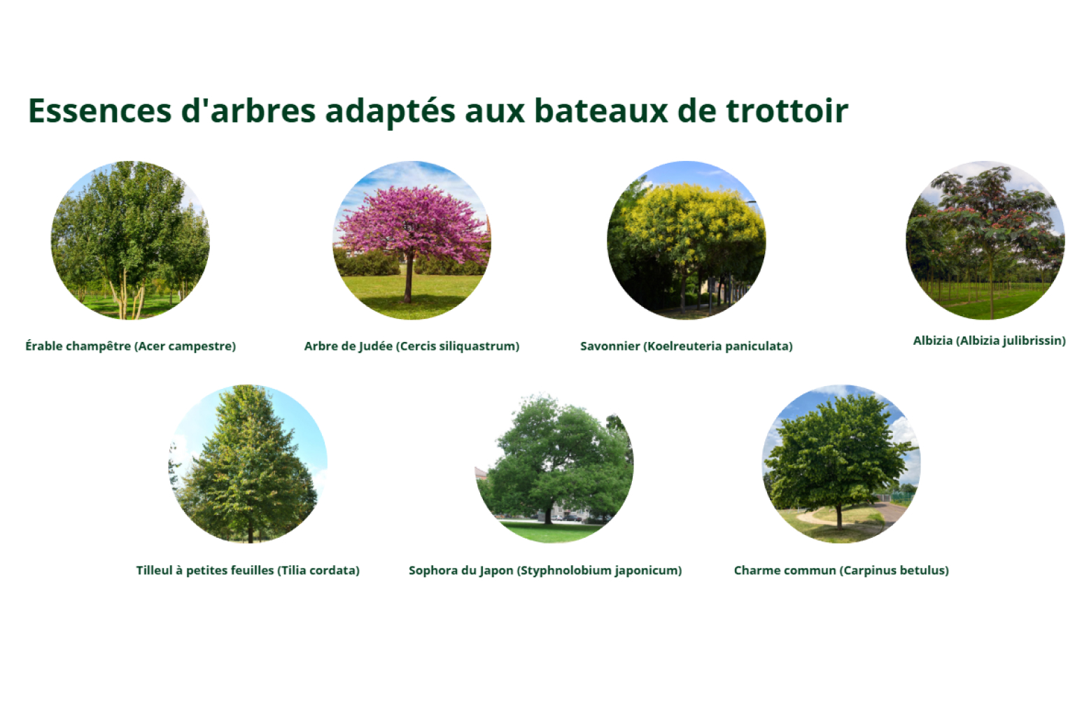 Ces essences ont été sélectionnées pour leur résistance à la sécheresse, leur système racinaire adapté au milieu urbain et leur contribution à la biodiversité (espèces mellifères, comestibles ou médicinales).