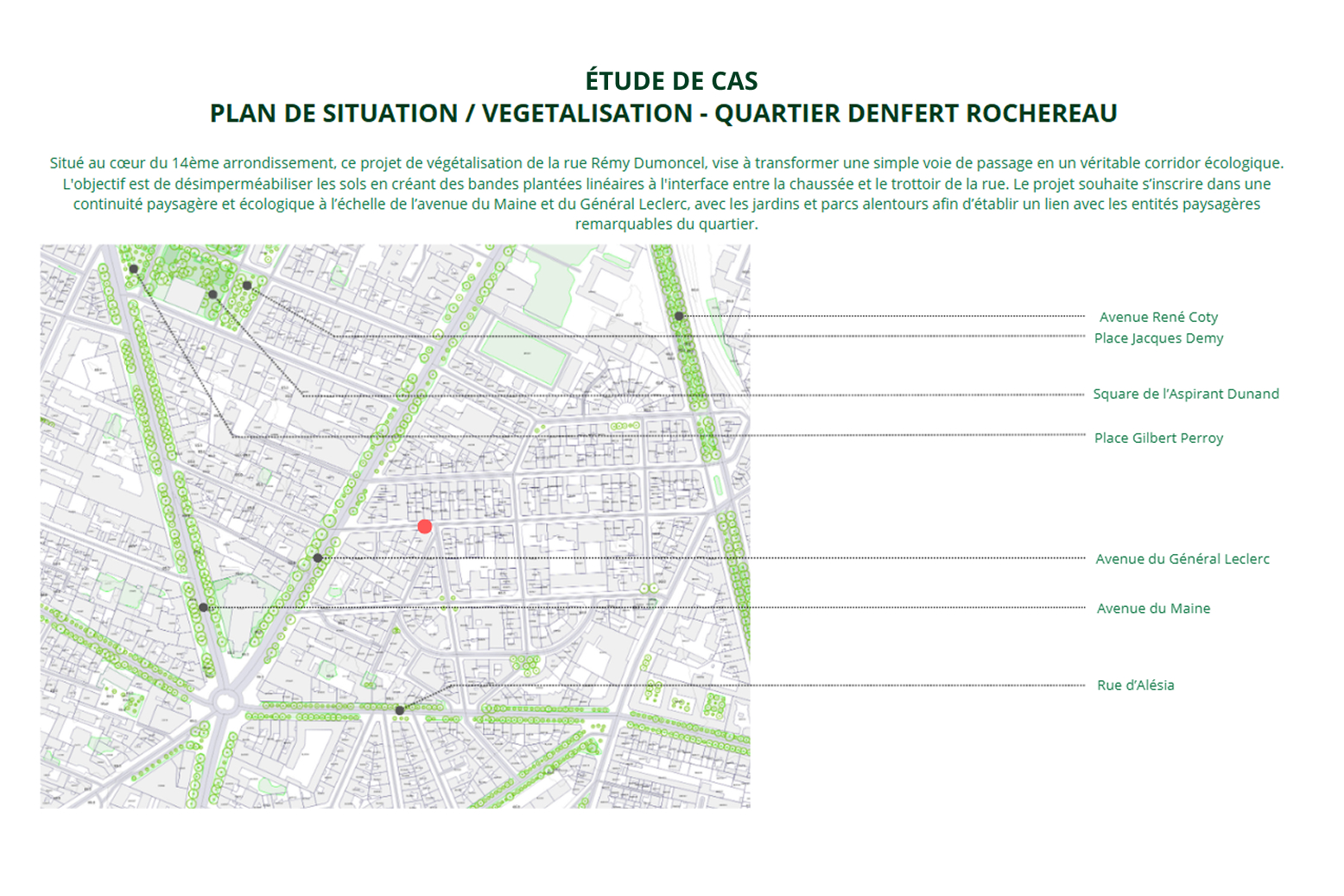 Objectif : Transformer une simple voie de circulation en un véritable corridor écologique reliant l'avenue du Maine, l'avenue du Général Leclerc et les espaces verts remarquables du quartier Denfert-Rochereau.