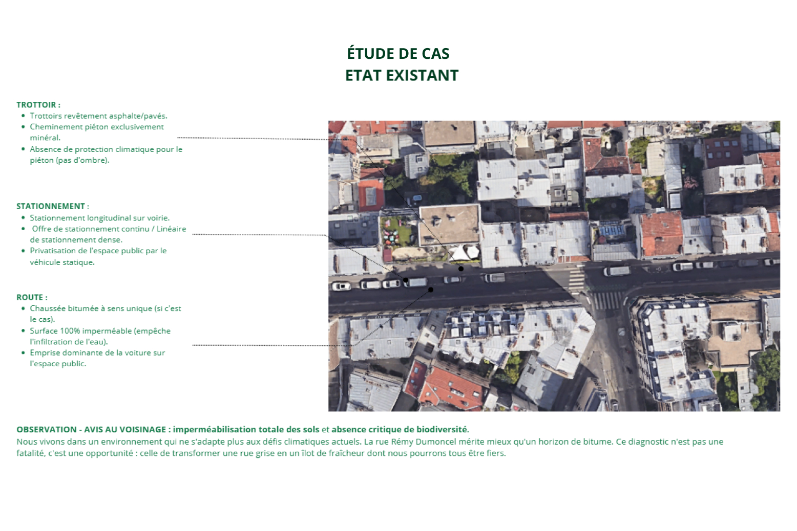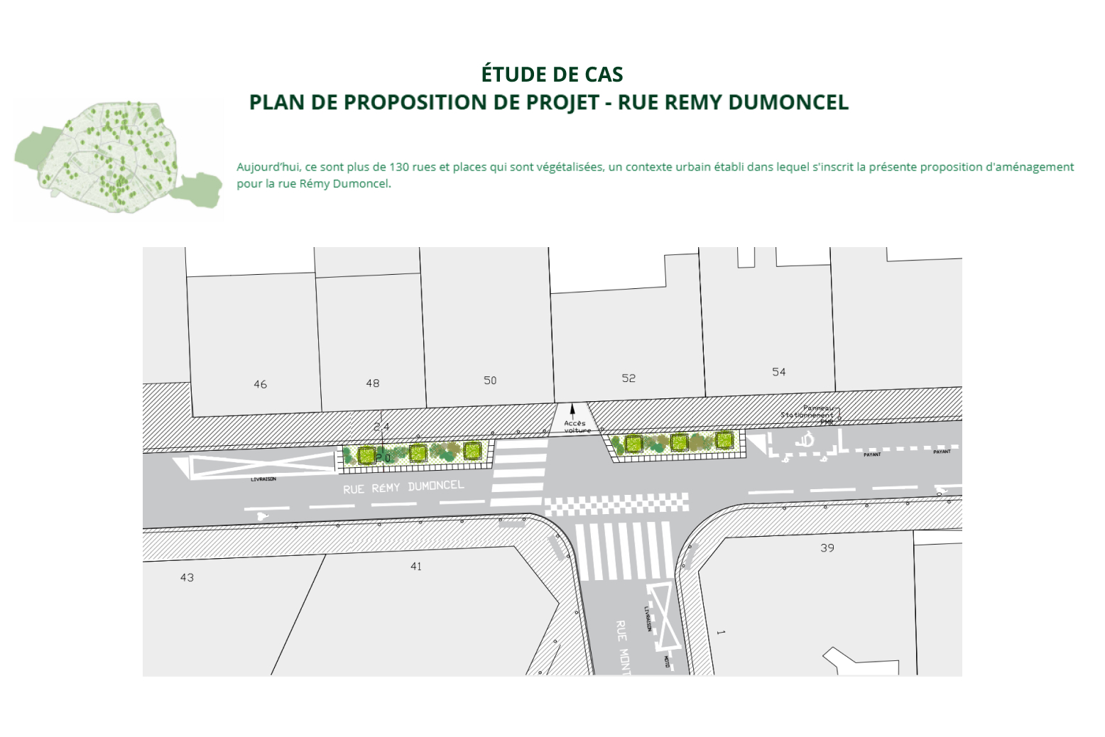 Pour illustrer le potentiel de cette transformation, nous avons développé un projet concret de végétalisation de la rue Rémy Dumoncel dans le 14ème arrondissement.